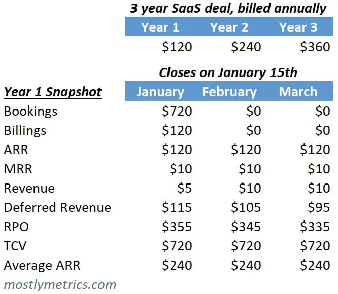 Revenue gets spread out, or accrued, to match the delivery of the product or service. In SaaS, total Revenue will usually trail total ARR and total Billings as it gets accrued over time. You’ll see in the example below.
