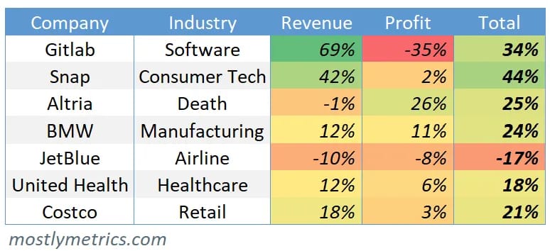 Trying to measure efficiency when you’re losing money can be a mixed bag of burritos. Some businesses raise a ton of money so they can prioritize growth at all costs (see: Gitlab). Other businesses are designed to run like a money printer, spitting out free cash flow and fat divvy's for shareholders (see: Altria).