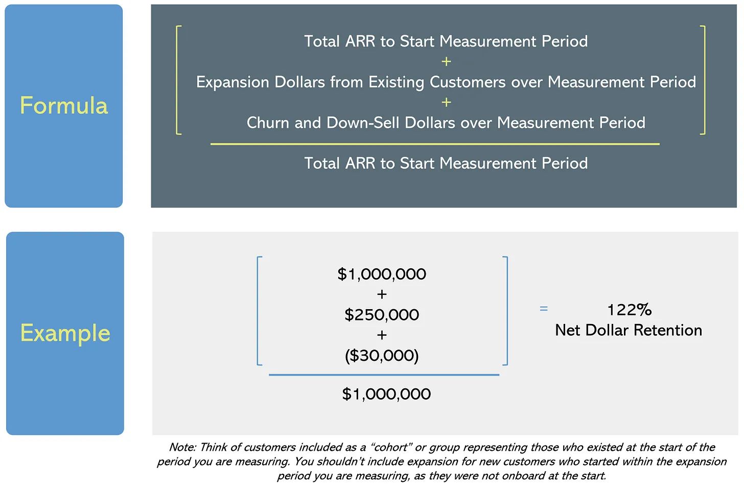 Net Retention basically throws all your existing customer dynamics into a pot, mixes them up, and spits back out how much your business will grow or decline by, absent any net new customer activity.