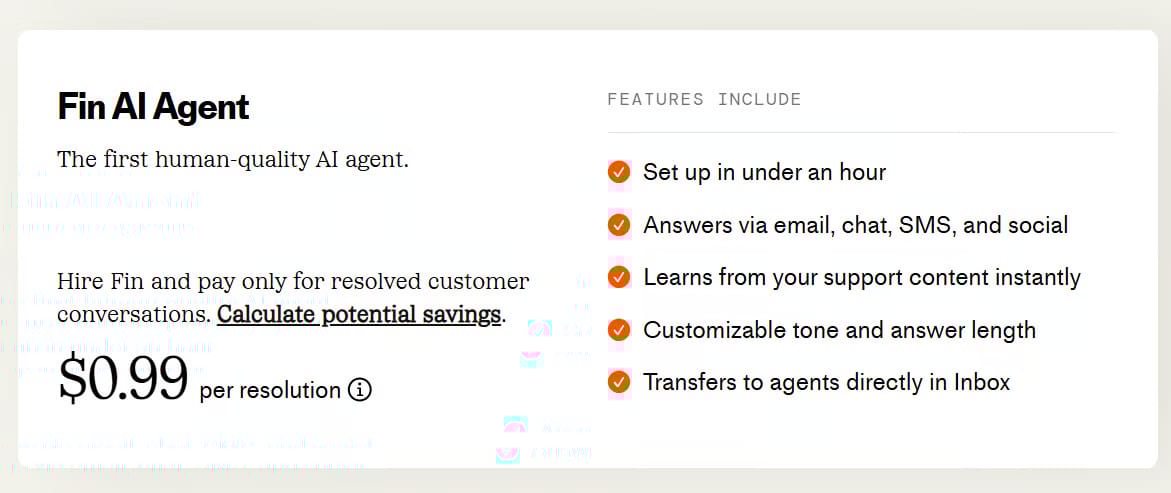 Said differently, a seat might cost the customer $100/month. If that human was handling 300 conversations, and now Fin handles them at 99 cents each, that's $297 in Fin revenue versus $100 in seat revenue.