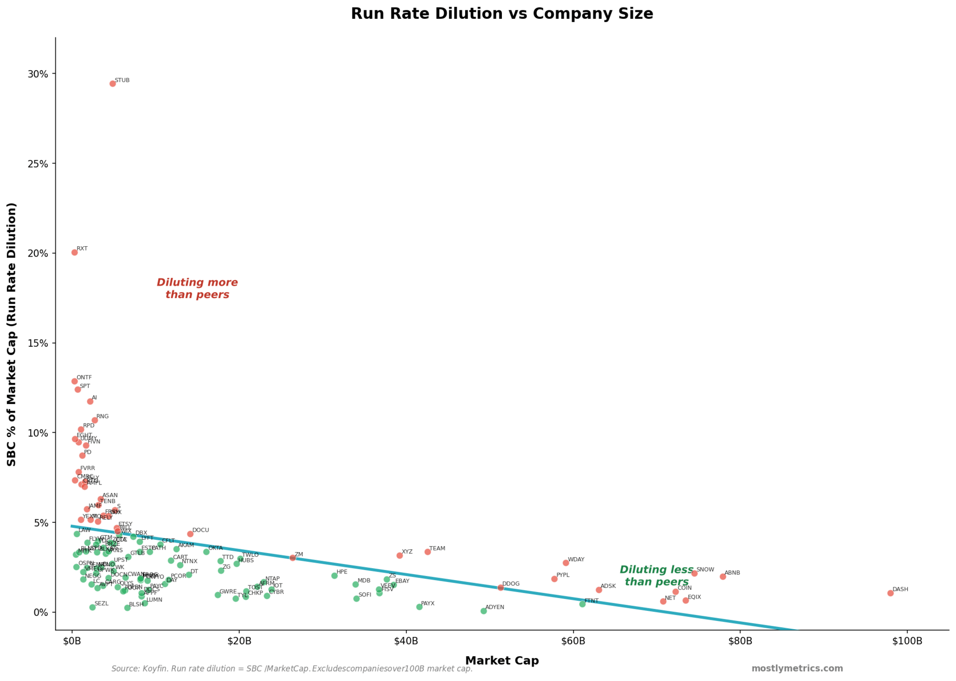 Companies above the line are diluting more than their peers relative to their market cap. Those below are doing better. The slope itself tells you something important: the bigger you are, the less dilution is acceptable.