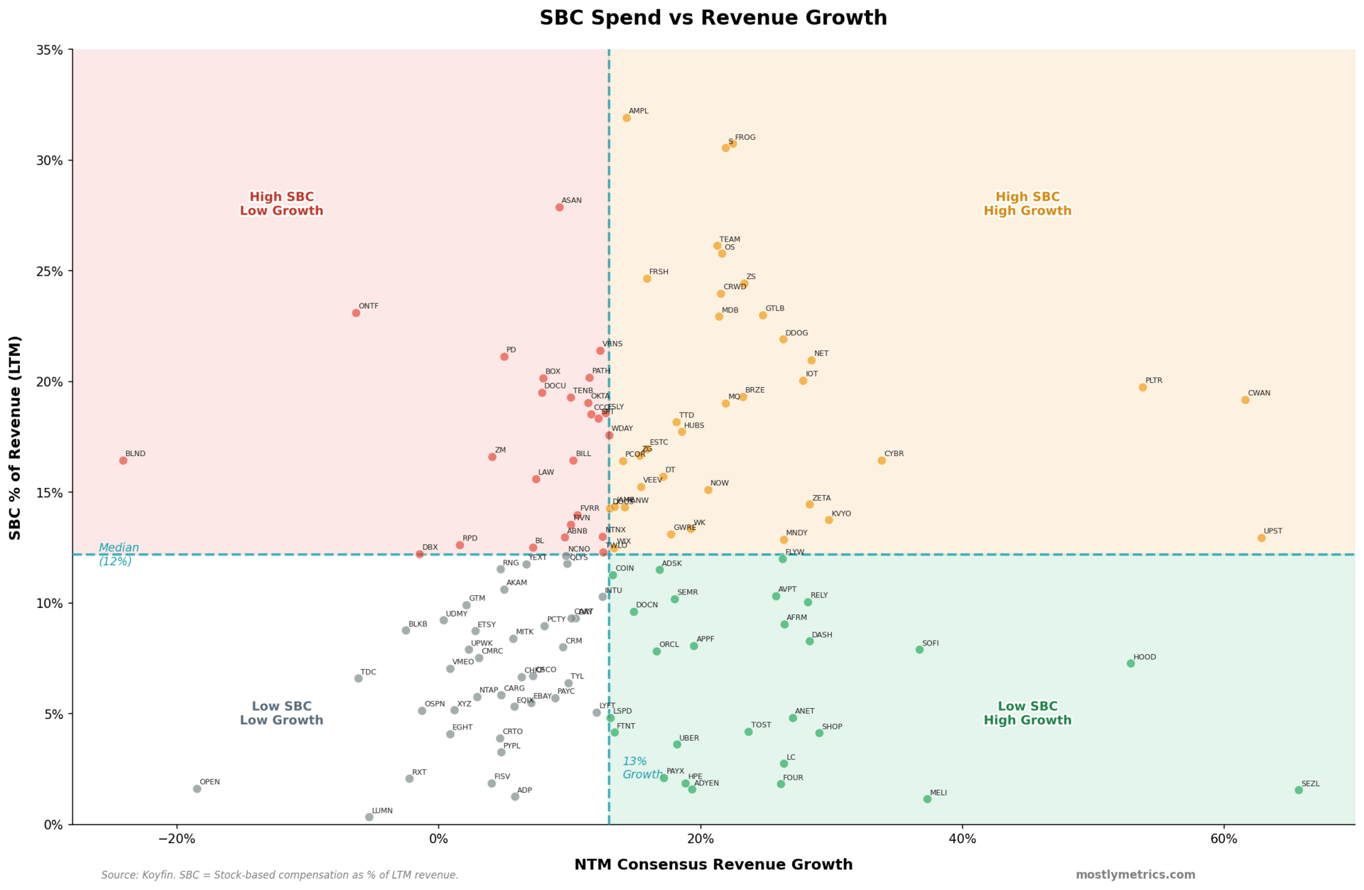 The upper left is the problem zone - high SBC, low growth. Asana, PagerDuty, Okta are all spending ~20% while growing ~single digits. Not a winning combo.