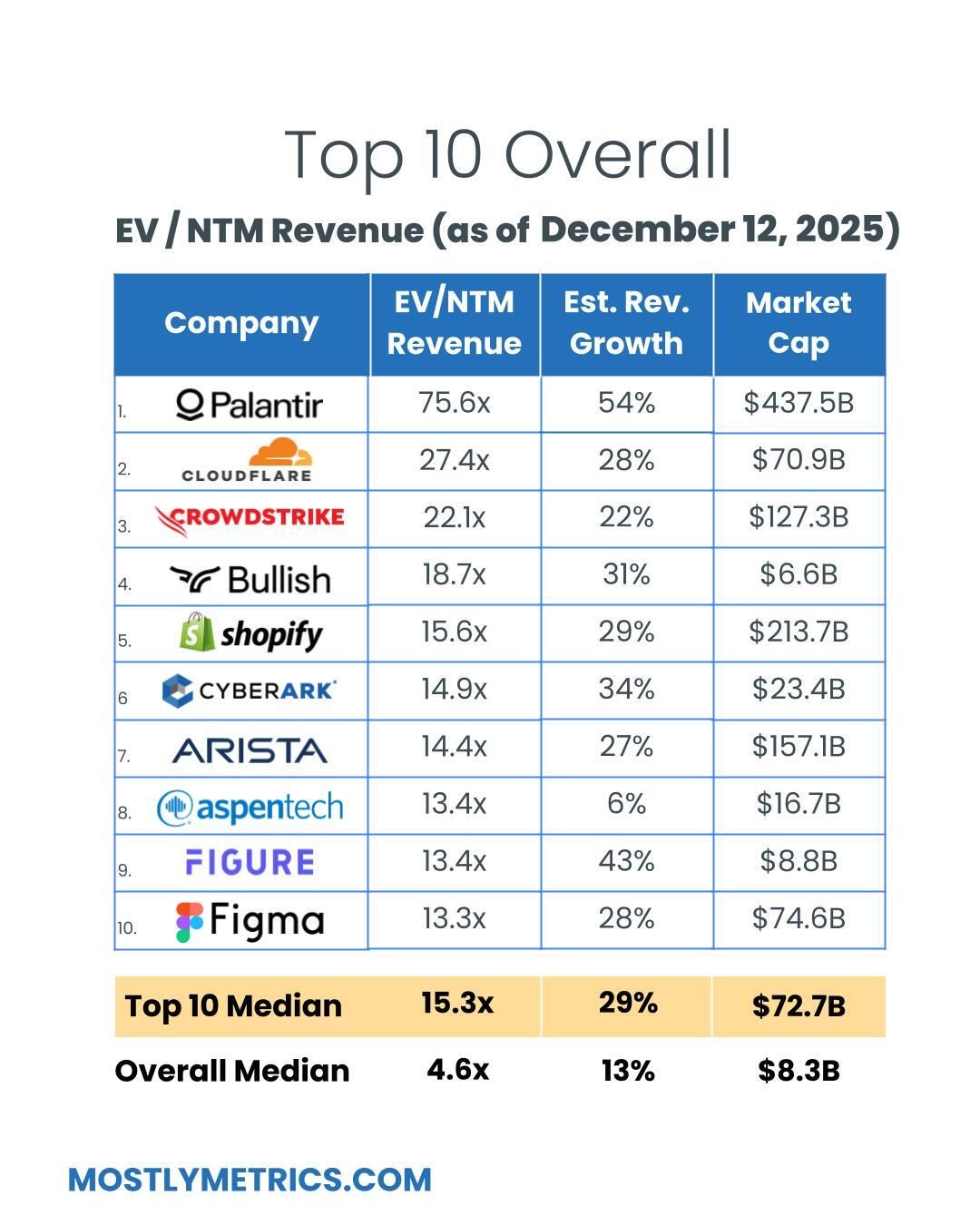 The 13% growth threshold is roughly the median NTM revenue growth for this universe as of 12/13/2025