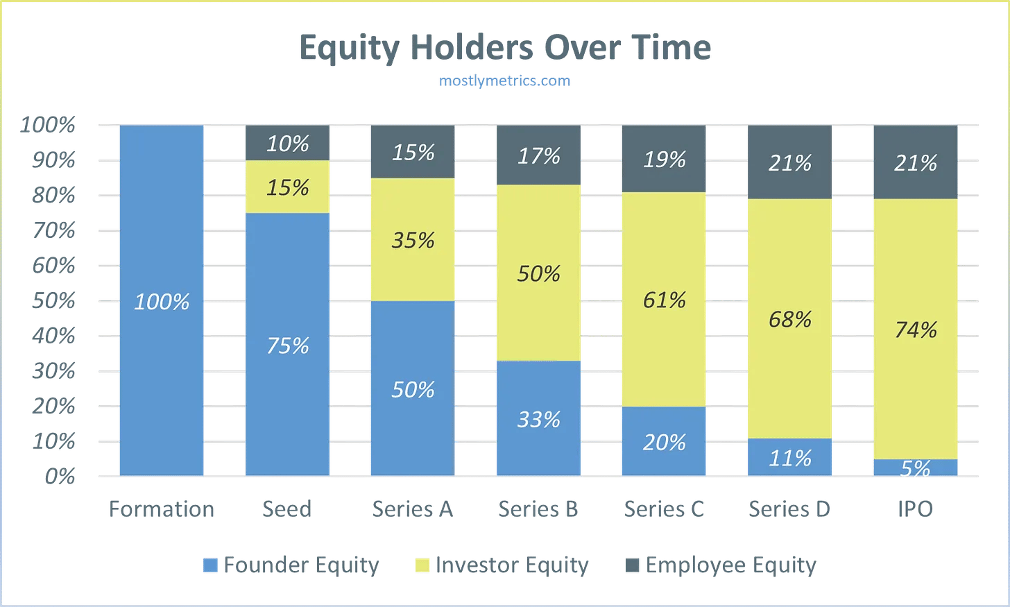 In startup land it’s a common misconception that CEOs hold the majority of the company’s equity. While this might be true early on (like heading into a pre-seed round early), a CEOs stake drops precipitously (spelling?) each time the company raises capital.