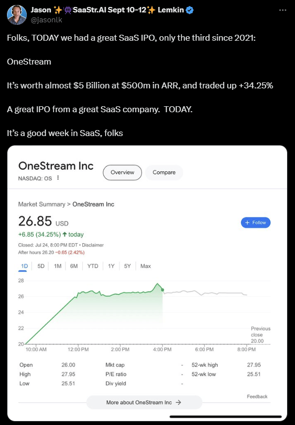 Congrats to the folks at OneStream on a successful IPO. They gifted SaaS fans with a rare sighting - a day one IPO pop!