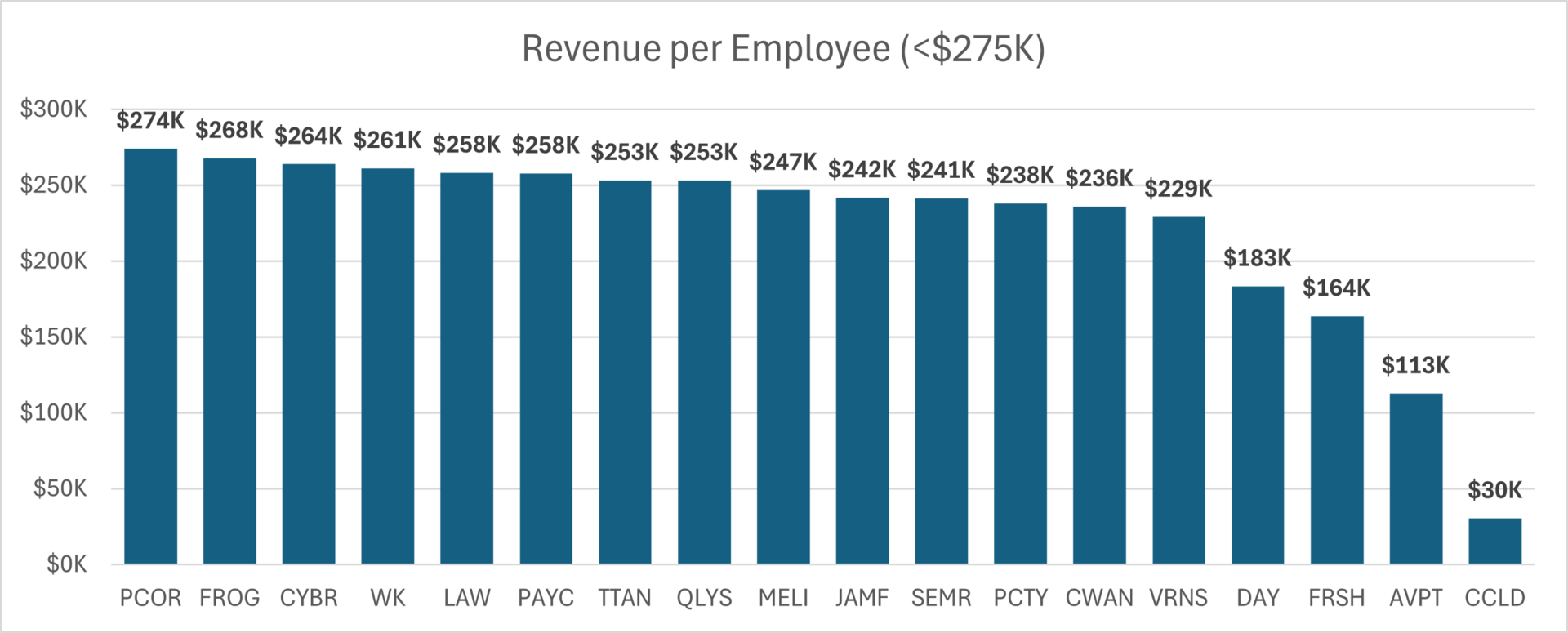 The laggards are full of predominantly field sales software companies: FROG, TTAN, JAMF, DAY. And at the bottom of the barrel is CareCloud, who’s holding onto dear life with +3,500 employees and $110M in revenue.