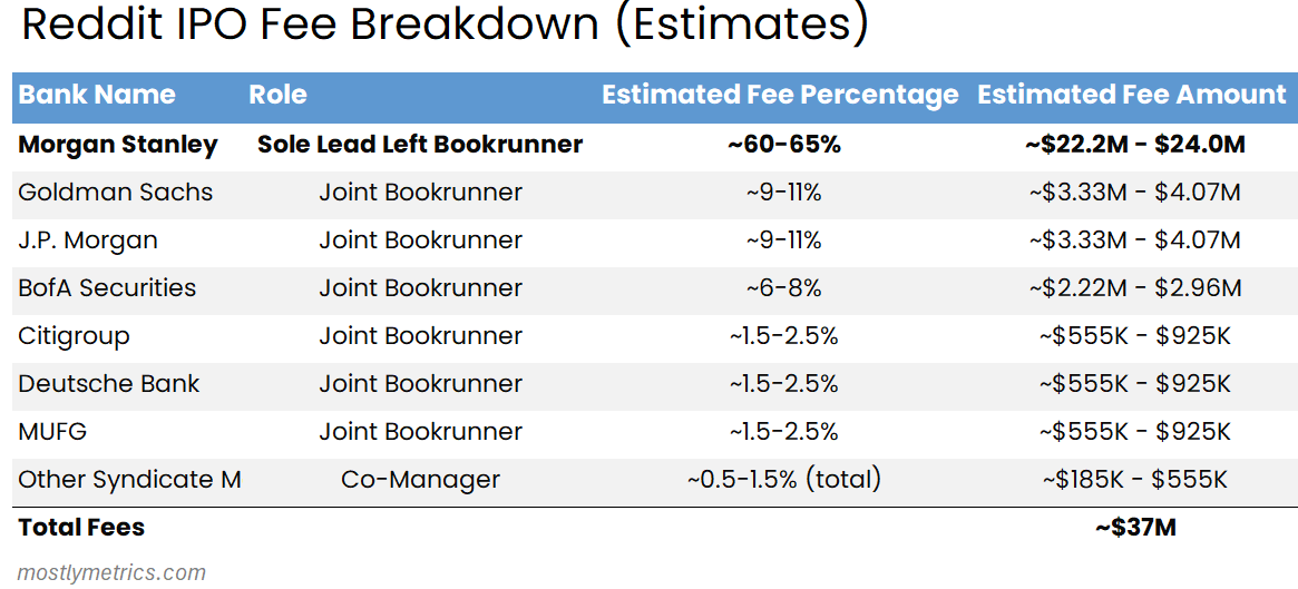 The exact commission by individual bank isn’t publicly available, but here’s an industry best guess estimate of how it may have been split up for Reddit: