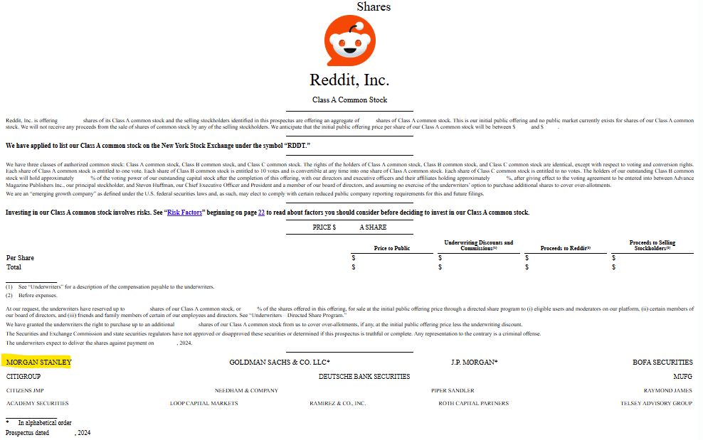 It’s important to remember that an IPO is the most lucrative product a bank can sell you. That’s why the courting process starts years beforehand. In Reddit’s case, Morgan Stanley had been working with the company across multiple products and advisory services since 2018. And they designed a bespoke way for Reddit to direct shares to moderators and users of the platform. They played a six year long game heading into 2024.