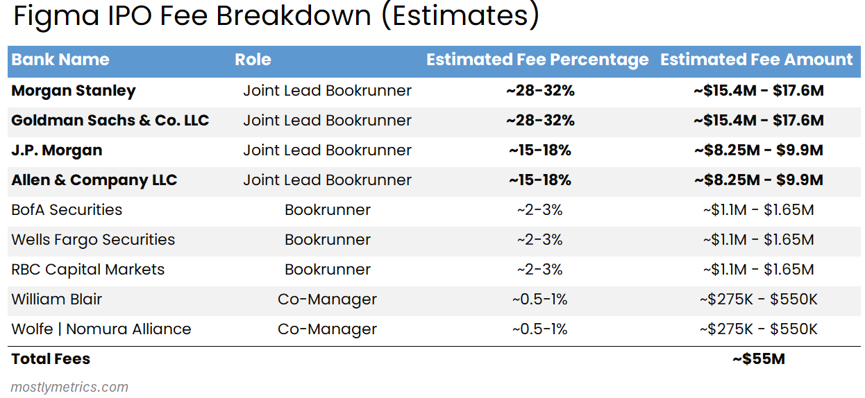 Notably, in recent years we’ve shifted from a “single lead left” to a “joint lead” model for larger IPOs. Figma is a great example. This IPO had FOUR lead book runners. That means that Morgan Stanley, Goldman, Allen & Co, and JP Morgan split the bulk of the proceeds (and left the Snicklefritz for the likes of Wells Fargo and William Blair).