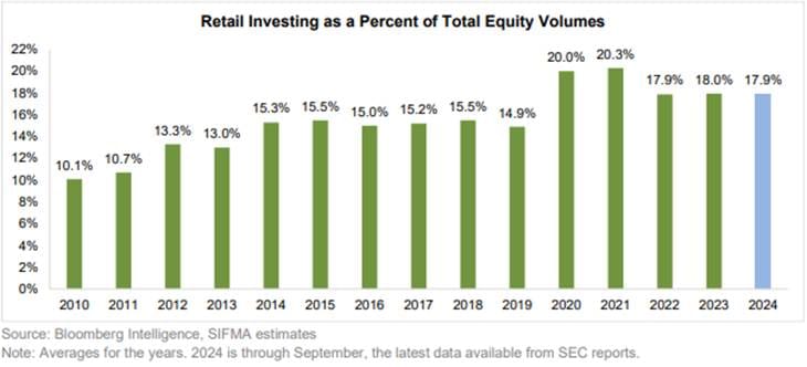 And finally, the below from SIFMA shows the increase in retail trading as a percentage of total U.S. equity volumes, though it is largely survey based and some estimates put retail trading as high as 45-50% of the overall market.
