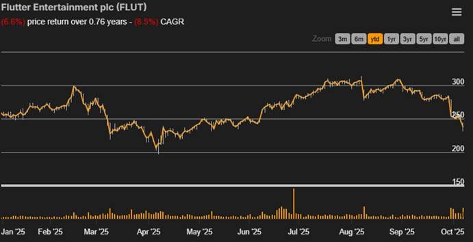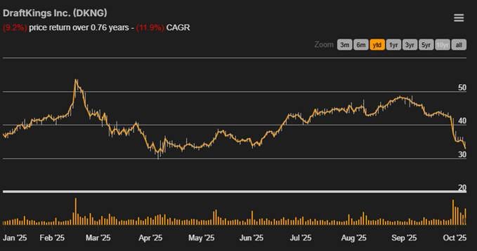 Of note, the explosion of prediction market activity has not only disrupted the traditional marketplaces space but has also had an impact on sports betting. Below are the share prices of DraftKings ($DKNG) and Flutter Entertainment ($FLUT) showing a steep decline since the end of August as prediction markets volume exploded in September.