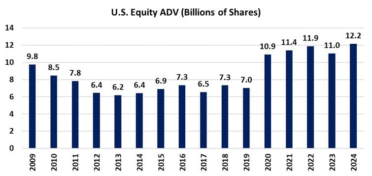 To exemplify the massive uptick in activity, the below graphs show the increase in U.S. equities and U.S. options average daily volumes (ADV) beginning in 2020.
