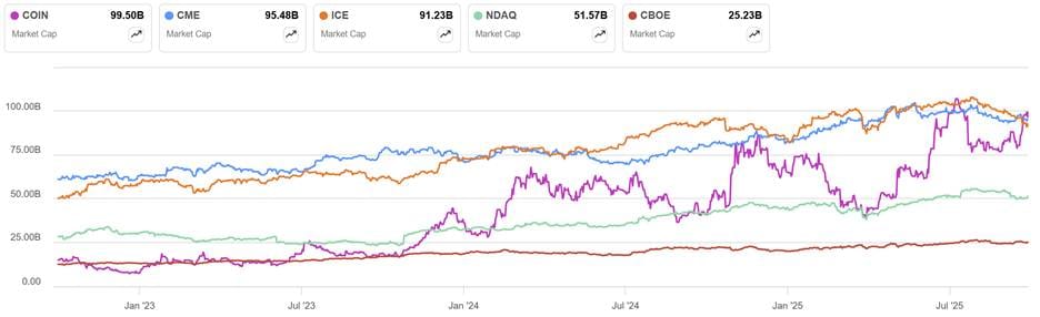 Coinbase has surpassed both CME and ICE, and is double NDAQ.