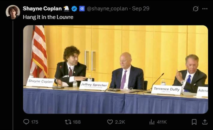 As a quick aside: the photo below is Terry Duffy (CEO of CME Group – ICE’s largest competitor) giving the bird to Shayne Coplan (CEO of Polymarket) with Jeff Sprecher (CEO of Intercontinental Exchange) sitting between them just 8 days before ICE announced its $2B investment in Polymarket. Maybe, if Terry had been nicer, he could have invested $2B in Polymarket 😊.