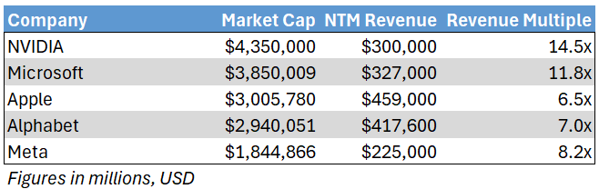 Revenue multiples are a shortcut to compare valuations across the technology landscape, where companies may not yet be profitable. The most standard timeframe for revenue multiple comparison is on a “Next Twelve Months” (NTM Revenue) basis.