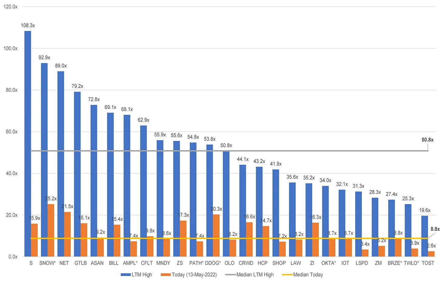 So if you’re a tech company, let’s check in on the comp set. Alex Clayton at Meritech Capital compared the peak NTM revenue multiples over the last twelve months to today. The peak multiple median was 50.8x and that median has dropped 80% to 8.8x in May of 2022.