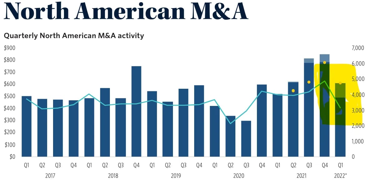 North American deal count and deal volume decreased by ~20% from Q4 of 2021 to Q1 of 2022. In overly simplistic terms, this means the recent population of deals added to your precedent cohort is akin to the proverbial turd in the punchbowl.