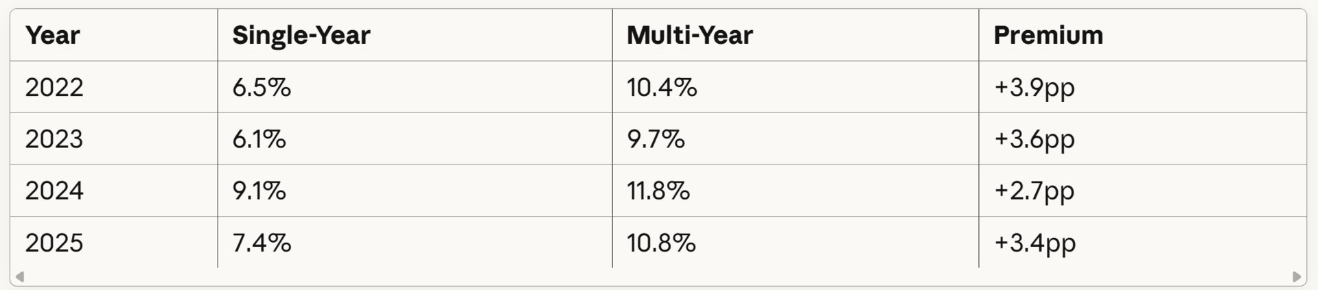 That +2.6pp premium in 2025 is the largest gap we’ve seen in recent memory. Multi-year is getting more valuable.